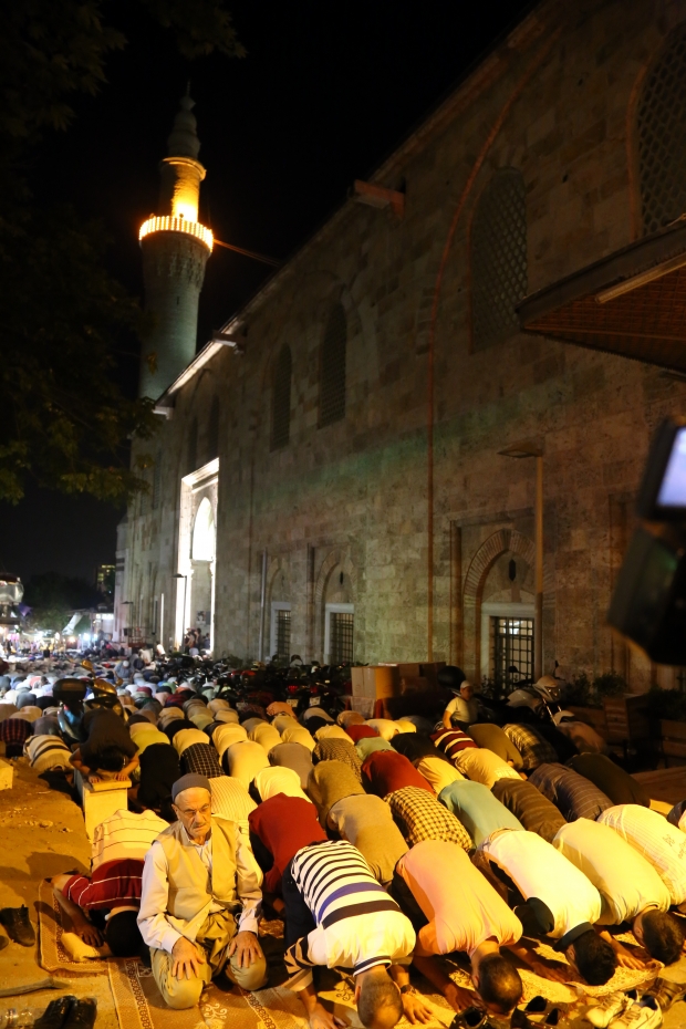Orucunu Orhangazi Parkı’nda ve Ulucami’nin avlusunda açan vatandaşlar, caminin girişinde ve şadırvanında uzun kuyruklar oluşturdu.Camilere sığmayan vatandaşlar avlu ve bahçelerde de teravih namazı kıldı. Camii çevresinde namaz kılacak yer bulamayan vatandaşlar ise diğer camilere akın etti.