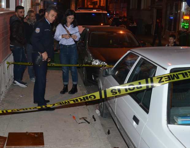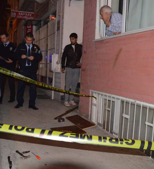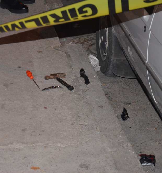 Olay yerinde, bıçak, çekiç ve tornavida bulunarak şeritle suç aletlerinin çevresi koruma altına alındı. Polisin soruşturması sürüyor.