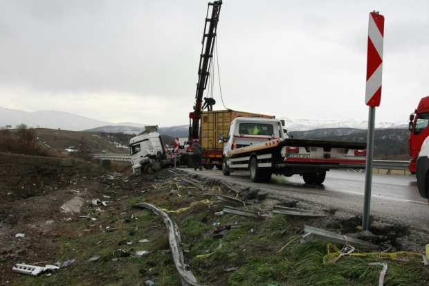 Daha öncede çok sayıda kazanın yaşandığı keskin virajlı yolda şoförler arasında ‘Makasladı’ diye tabir edilen şekilde yan dönen TIR bariyerleri parçalayarak yolun ortasında kaldı.