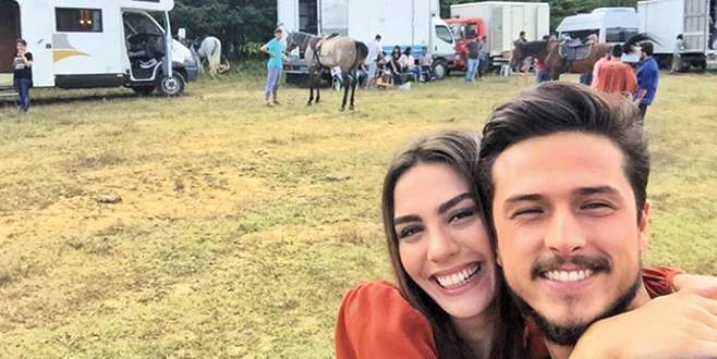 Setin hazırlanmasını bekledikleri sırada selfie yapan başrol oyuncuları Ruveyda Öksüz ve Gökhan Keser, ‘Çekimlere tam gaz devam’ dedi.