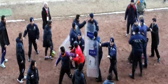 Polis olayları güçlükle önledi. 13 Şubat Şehir Stadyumu’nda Bölgesel Amatör Lig 2. Gurup müsabakasında ev sahibi 13 Şubat Erzincanspor, Iğdır Arasspor’u konuk etti. Iğdır Arasspor’un 1-0 üstünlüğü ile devam eden karşılaşmanın 88. dakikasında konuk ekipten Sebahattin, rakibine faul yapınca karşılamanın orta hakemi Serkan Gözel tarafından kırmızı kartla cezalandırılarak oyun dışı bırakıldı. Kırmızı kart gören Sebahattin sahayı uzun süre terk etmemesi gerginliğe neden oldu. Sahadan çıkmamak için ısrar eden futbolcuya 13 Şubat Erzincanspor’lu futbolcuların tepkisi sert oldu ve saha bir anda karıştı. Tekmeler ve yumrukların havada uçuştuğu olaylar,saha kenarı da sıçrarken, olayları güvenlik güçleri güçlükle önledi.