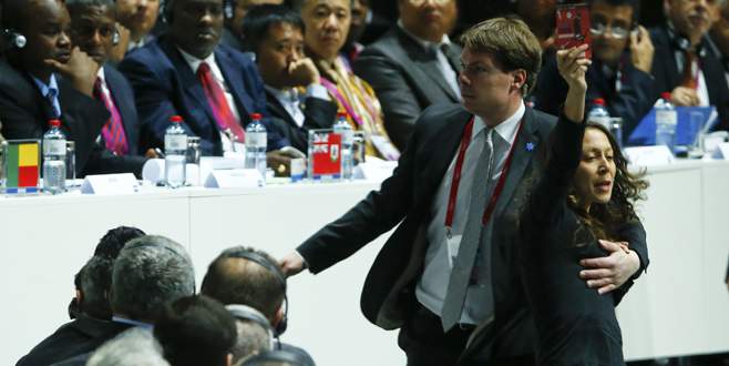 Göstericiler, FIFA’ya kırmızı kart gösterdi. Göstericiler Başkan Sepp Blatter’in konuşmasını da yarıda keserken, fiziksel bir müdahalede bulunmadılar. Göstericiler, ‘Bağımsız futbol, bağımsız Filistin’ sloganı attı.