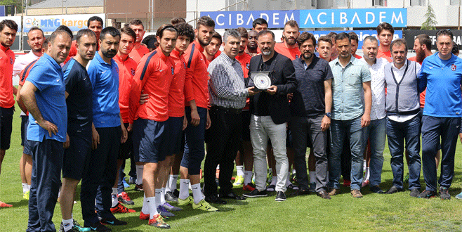Futbol Koordinatörü Yılmaz Büyükaydın ve yönetim kurulu üyesi Özer Bayraktar, Mandıralı ve ekibine plaket verdi.