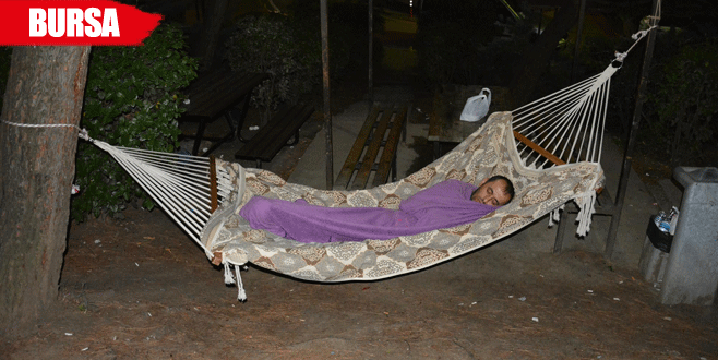 Uludağ Üniversitesi Tıp Fakültesi Hastanesi’nde yatan hastaların yakınları, kalacak yer bulamayınca, yanlarında getirdikleri hamakları hastane önündeki bahçede ağaçlar arasına kurup üzerinde ya da çimlerin üzerinde yatıyor. Hasta yakınları, fakülte hastan