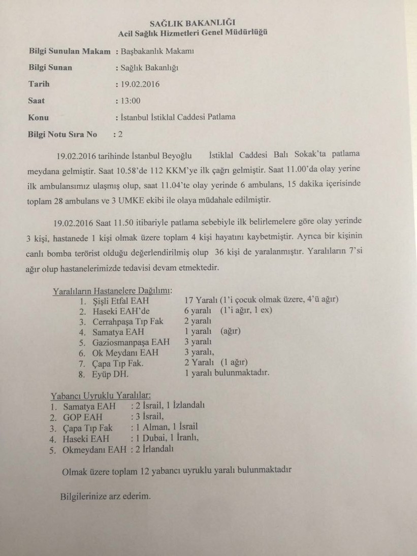 İstanbul Valisi Vasip Şahin: “Beyoğlu’nda kaymakamlık önünde öğleden önce bir canlı bomba kendini patlatarak 4 vatandaşımızın ölümüne sebebiyet vermiştir, 37 vatandaş yaralı olarak hastanelere kaldırıldı. Bunlardan 3’ü ağırdı. Bunlardan biri de biraz önce hastanede vefat etmiştir. Ölü sayısı 5’e yükselmiştir” dedi.