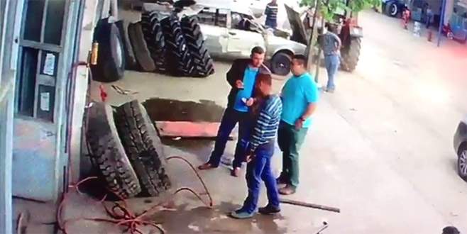 Manisa’nın Kula ilçesinde, lastik tamir atölyesinde bir TIR’a ait lastiğin kompresör ile şişirildiği sırada patlaması büyük korkuya sebep oldu. Şişirme esnasında atölye önünde bulunan 3 kişiden biri, yüksek basınçla patlayarak üzerine düşen lastiğin altın