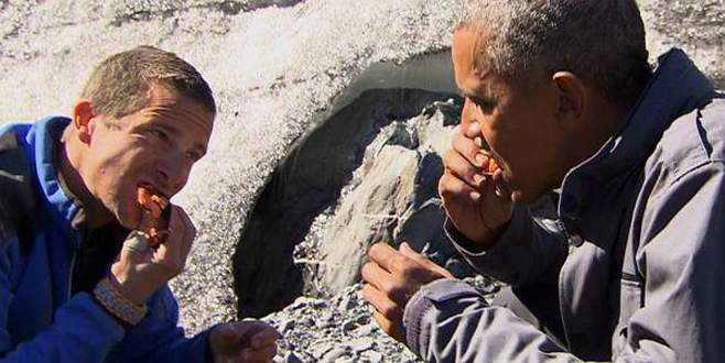 Ünlü maceracı ve hayatta kalma uzmanı Bear Grylls ile birlikte Alaska’da vahşi doğayla mücadele ederek üç gün geçiren ABD Başkanı Barack Obama, Amerikan NBC televizyonunda yayınlanan görüntülere göre, Obama, Bear Grylss’in bir ırmak kenarında bulduğu ayılar tarafından kısmen yenmiş bir somonu pişirerek ‘hayatta kaldı’ Obama artık balığı yedikten sonra ‘yine de güzelmiş’ dedi.