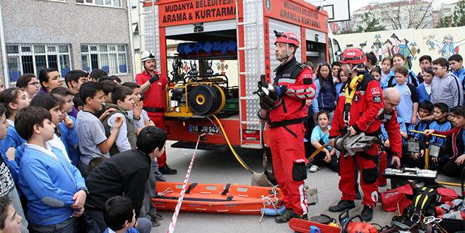 Mudanya Arama Kurtarma (MAK) ekibi, Sivil Savunma Haftası dolayısıyla Hatice-İsmail-Hakkı Kayan İlk Öğretim Okulu’nda tatbikat yaptı. Alarmın çalmasıyla öğrenciler okulu kısa sürede tahliye etti. Verilen bilgileri can kulağı ile dinleyen öğrencilerin heyecanlı oldukları görüldü. Okullarda doğal afetin kötü neticelere sebebiyet vermemesi için en büyük görevin öğretmenlerde olduğunu belirten MAK ekipleri, öğretmenleri bu konularda bilgilendirdi. Öğrencilere enkaz altında kalanları kurtarmakta kullanılan teçhizatlar da tanıtıldı. Aletlerin ne işe yaradıkları tek tek gösterildi.