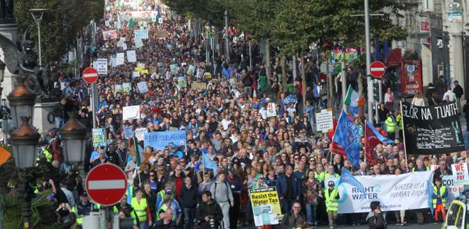 Hükumetin getirdiği yeni düzenlemelere göre herkes su faturası adı altında belli bir ücret ödemek zorunda kalacak. Düzenlemeye tepki gösteren on binlerce kişi başkent Dublin’de hükumeti protesto etti. Başkentteki gösteriye katılan yaklaşık 80 bin gösterici ellerindeki Yunanistan bayrağı ile Yunan halkına dayanışma mesajı verdi.