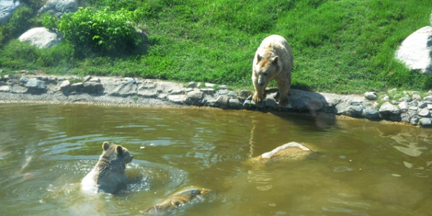Bursa Hayvanat Bahçesi’ndeki kaplan ve ayılar, aşırı sıcaklar nedeniyle kendilerine ayrılan bölümdeki gölete girerek serinlemeye çalıştı.