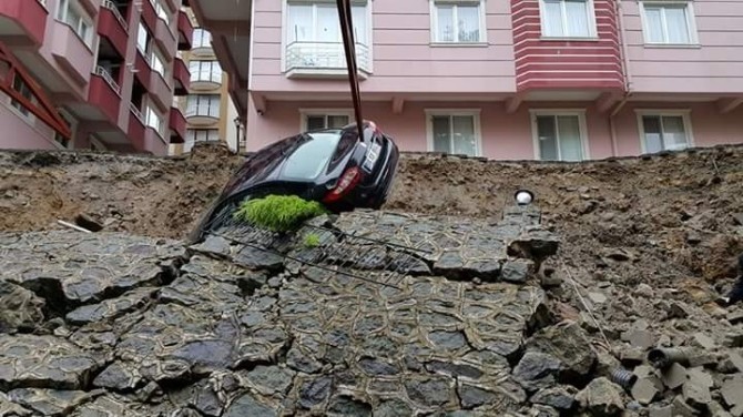 Trabzon’un Of ilçesinde bugün sabah saatlerinde meydana gelen heyelanda bir sitenin istinat duvarı çökerken, 2 otomobil hasar gördü.