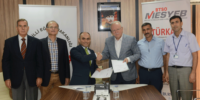 İl Milli Eğitim Müdürlüğü ile Mesleki Yeterlilik Sınav ve Belgelendirme Merkezi (MESYEB) arasında mesleki standartları yükseltmek ve belgelendirmek amacıyla işbirliği protokolü imzalandı.Protokole Bursa İl Milli Eğitim Müdür Yardımcısı Ekrem Koz ve BTSO M