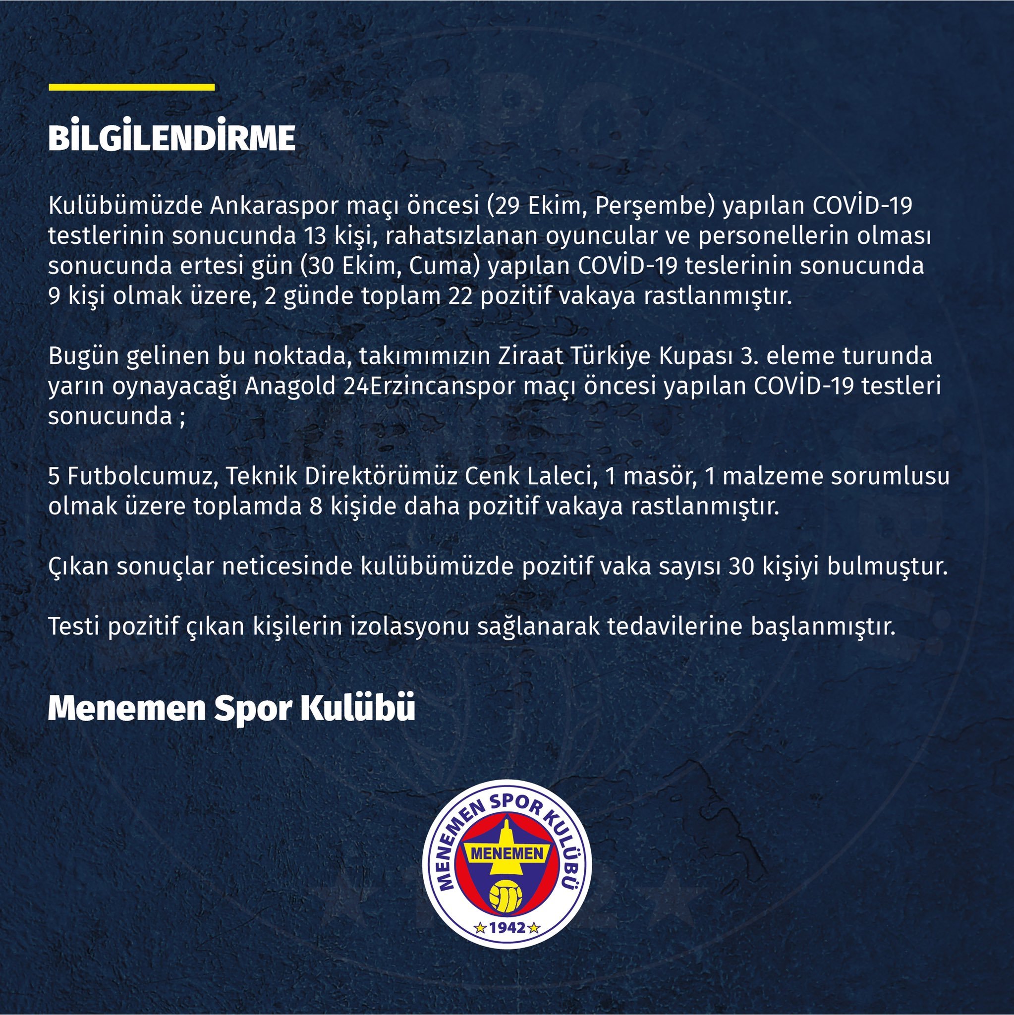 Ana Sayfa › Final › Futbol › 1.Lig ekibinde büyük şok! Vaka sayısı 30’a çıktı…1.Lig ekibinde büyük şok! Vaka sayısı 30’a çıktı… Menemenspor, kulüpteki corona virüs vaka sayısının 30’a yükseldiğini açıkladı. Giriş: 03-11-2020 13:16Kaynak: FutbolFinal ABONE OL + - Menemenspor, kulüpteki corona virüs vaka sayısının 30’a yükseldiğini açıkladı. Kulüpten yapılan açıklama şöyle; HABERİ PAYLAŞ