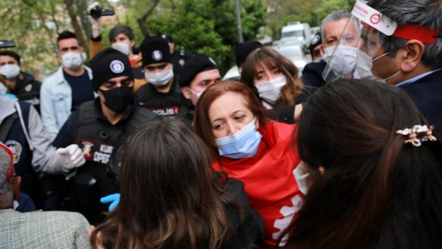 Aralarında DİSK Genel Başkanı Arzu Çerkezoğlu’nun da bulunduğu 15 kişi gözaltına alınarak polis minibüsüne bindirildi. Gözaltına alınanlar emniyet müdürlüğüne götürüldü.
