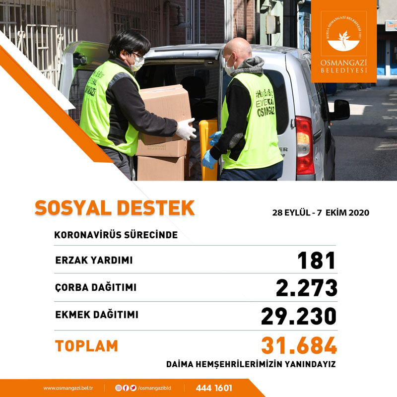 Yürütülen çalışmalar kapsamında ekipler son 10 günde 181 erzak, 2 bin 273 çorba ve 29 bin 230 ekmeği ihtiyaç sahiplerine ulaştırdı. Toplam 31 bin 684 sosyal destek sağlayan belediye ekipleri, vatandaşların tedbiri elden bırakmamaları konusunda uyarılarda bulundu.