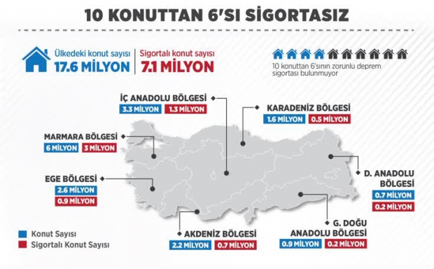 DASK’ın verilerine göre, ülkedeki konut sayısı 17,7 milyon, sigortalı konut sayısı 7,1 milyon, sigortalılık oranı ise yüzde 40,4 düzeyinde.
