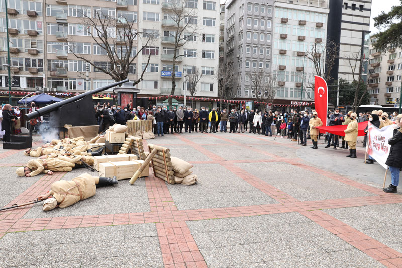 Vatandaşların yoğun ilgi gösterdiği bir diğer etkinlik ise Tarihi Belediye Binası önündeki UNESCO Meydanı’nda yapıldı. Meydan Çanakkale platosuna dönüştürülürken, Seyrü Keyf Tiyatro Topluluğu, Mecidiye Tabyasında Seyit Onbaşı’nın dev top mermisini kaldırması ve Ocean Zırhlısının vurulması anını canlandırdı. Bursa Büyükşehir Belediye Başkanı Alinur Aktaş’ın da dikkatle izlediği gösteride bazı vatandaş gözyaşlarına hakim olamadı.