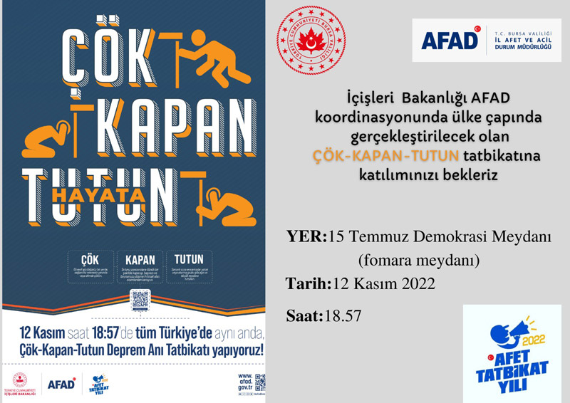 81 il ve ilçelerinde eş zamanlı olarak gerçekleştirilecek olan Tatbikat, 12 Kasım 2022 Cumartesi günü saat 18.57‘de ÇÖK-KAPAN-TUTUN hareketi ile uygulanacak.