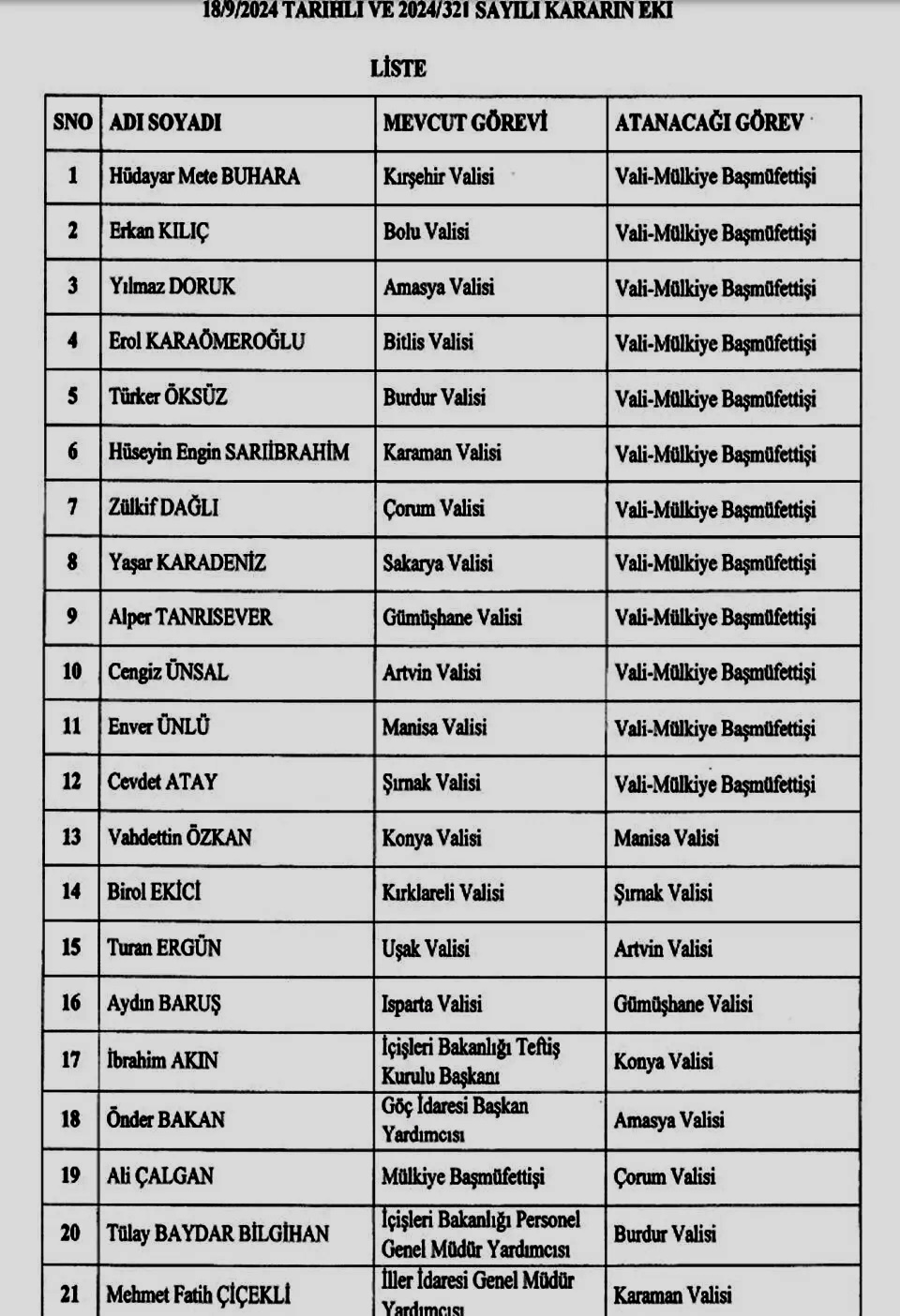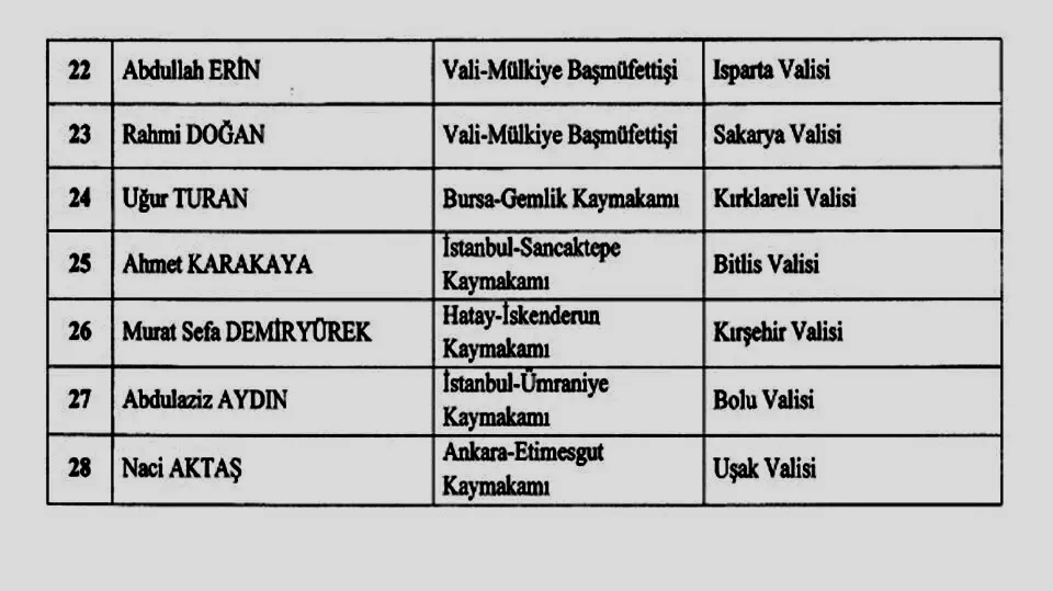 Cumhurbaşkanı Recep Tayyip Erdoğan imzasıyla Resmi Gazete’de yayımlanan kararname ile Hüdayar Mete Buhara, Erkan Kılıç, Yılmaz Doruk, Erol Karaömeroğlu, Türker Öksüz, Hüseyin Engin Sarıibrahim, Zülkif Dağlı, Yaşar Karadeniz, Alper Tanrısever, Cengiz Ünsal, Enver Ünlü ve Cevdet Atay “vali-mülkiye başmüfettişliği” görevine getirildi.