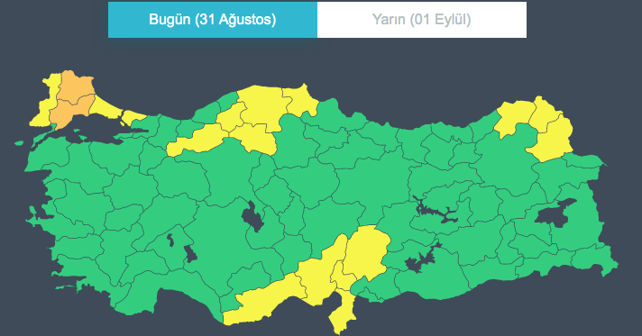 Sarı kodla uyarılan iller: Adana, Ardahan, Artvin, Bolu, Çankırı, Edirne, Hatay, Mersin, İstanbul, Kars, Kastamonu, Kahramanmaraş, Karabük, Sinop ve Osmaniye.