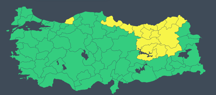 Meteoroloji Genel Müdürlüğü Artvin, Bingöl, Elazığ, Erzincan, Erzurum, Giresun, Gümüşhane, Muş, Ordu, Rize, Sivas, Tokat, Trabzon, Tunceli, Yozgat, Bayburt ve Ardahan’a sarı kodlu uyarıda bulundu.