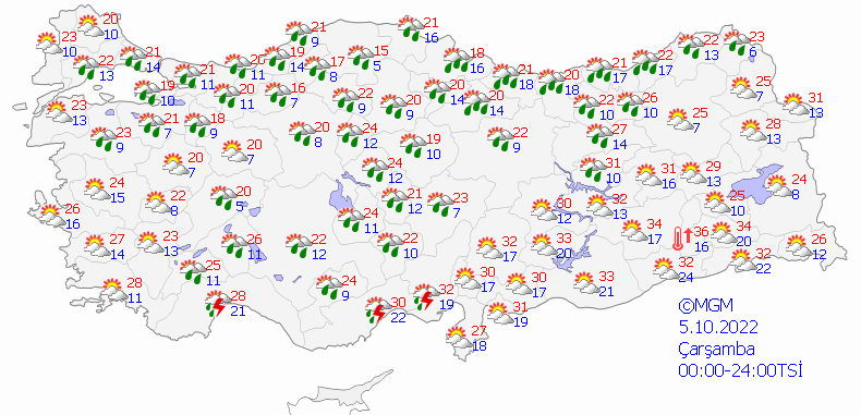 Meteoroloji Genel Müdürlüğü tarafından yapılan son değerlendirmelere göre: Kuzey, iç ve güneybatı kesimlerinin parçalı ve yer yer çok bulutlu, Marmara ve İç Anadolu’nun doğusu, Karadeniz ile Antalya, Mersin, Adana, Karaman, Çankırı ve Erzincan çevrelerinin sağanak ve gök gürültülü sağanak yağışlı, diğer yerlerin az bulutlu ve açık geçeceği tahmin ediliyor. Yağışların; Ordu ve Tokat çevreleri ile Yozgat’ın doğu, Sivas’ın kuzey ve batı çevrelerinde yerel kuvvetli olması bekleniyor.