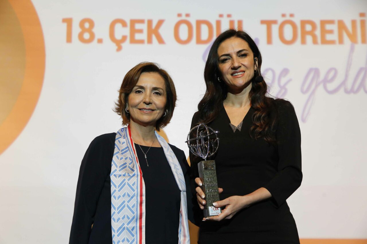 Plaket töreninin ardından Eğitime Katkı Ödülü’nü almaya hak kazanan Dilek Livaneli’ne ödülü ÇEK Yönetim Kurulu Başkanı Nihan Alpay tarafından takdim edildi.