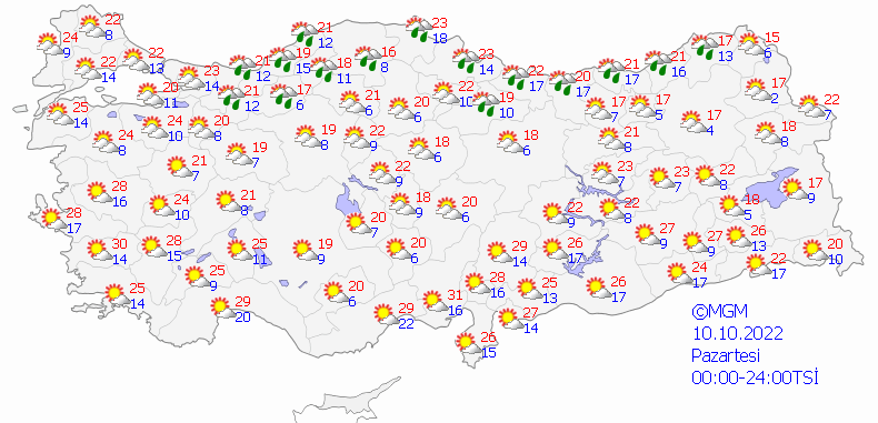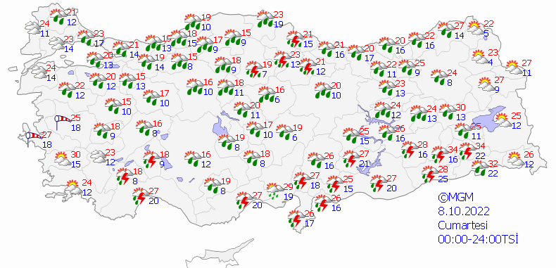 Meteoroloji Genel Müdürlüğü tarafından yapılan son değerlendirmelere göre: Ülke genelinin parçalı yer yer çok bulutlu, Marmara’nın güney ve doğusu, İç Ege ve Muğla, Akdeniz, (Kayseri, Niğde ve Yozgat il merkezleri hariç) İç Anadolu, Batı ve Orta Karadeniz, Doğu Karadeniz kıyı illerinin iç ve yüksek kesimleri ile Malatya’nın batı çevrelerinin sağanak ve yer yer gök gürültülü sağanak yağışlı geçeceği tahmin ediliyor. Yağışların öğle saatlerinde Batı Akdenizin iç kesimleri ve Konya çevreleri, Antalya’nın doğu, Muğla’nın kıyı kesimlerinde kuvvetli olması bekleniyor.