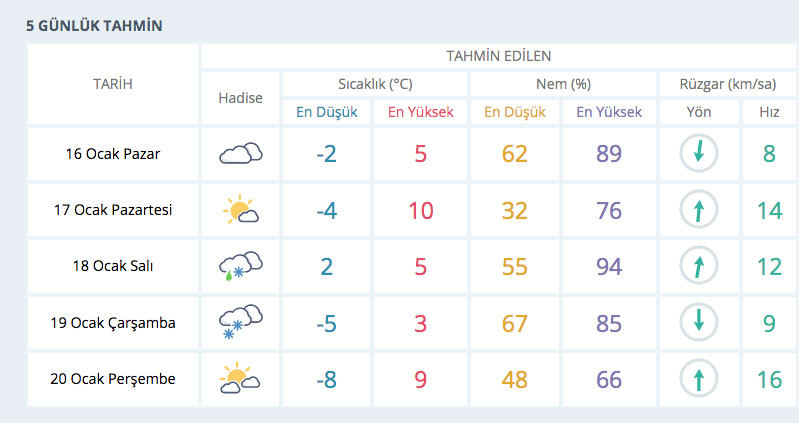 Meteoroloji 14. Bölge Müdürlüğünden yapılan açıklamada, bölge genelinde havanın parçalı ve çok bulutlu olacağı belirtilerek, “Van, Bitlis ve Hakkari çevrelerinin kar yağışlı geçeceği, yağışların öğle saatlerinden itibaren Van’ın kuzeyi ile Bitlis çevrelerinde etkisini yitireceği, buzlanma ve don olayı ile birlikte sis ve pus hadisesinin görüleceği tahmin ediliyor. Hava sıcaklıklarının mevsim normallerinin altında seyredeceği tahmin ediliyor. Rüzgarın genellikle kuzeyli yönlerden orta kuvvette, öğle saatlerinden itibaren Bitlis ve Muş çevrelerinde zaman zaman kuvvetli eseceği tahmin ediliyor. İl merkezlerimiz için beklenen günün en yüksek sıcaklıklar; Hakkari’de eksi 3, Van, Bitlis ve Muş’ta etsi 5 derece olması bekleniyor. Yüksek kar örtüsü bulunan eğimi fazla dik yamaçlarda çığ riski bulunduğundan yetkililerin ve vatandaşların dikkatli ve tedbirli olmaları gerekmektedir. Sabah ve gece saatlerinde buzlanma ve don olayı ile birlikte pus ve sis hadisesi beklendiğinden yaşanabilecek olumsuzluklara (buzlanma, don, ulaşımda aksamalar, görüş mesafesinde daralma vb) karşı dikkatli ve tedbirli olunması gerekmektedir” denildi.