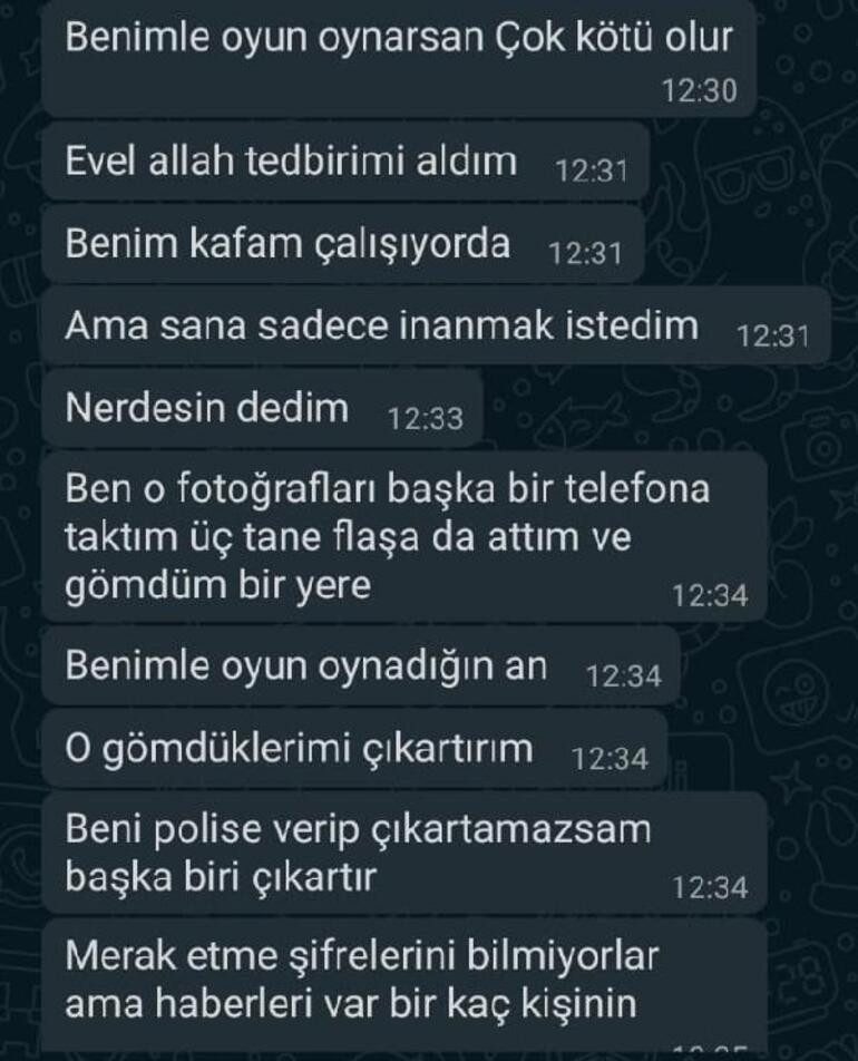 Fotoğraflar yüzünden babasının rahatsızlandığını söyleyen A.M., eski sevgilisinin farklı telefon numaralarından kendisine sürekli tehdit mesajları göndermeye devam ettiğini belirterek yardım istedi. M.Ç. hakkında 3 kez şikayet dilekçesi verdiğini anlatan A.M., “Benim başka fotoğraflarım da olduğunu iddia ediyor. Fotoğrafların içeriğini bilmiyorum, fotoğrafları 3 ayrı flaş diske kaydedip toprağa gömdüğünü ileri sürüyor. Şikayet edersem onları çıkartıp, aileme göndereceğini söylüyor. Sürekli farklı telefonlarla mesaj gönderiyor” dedi.