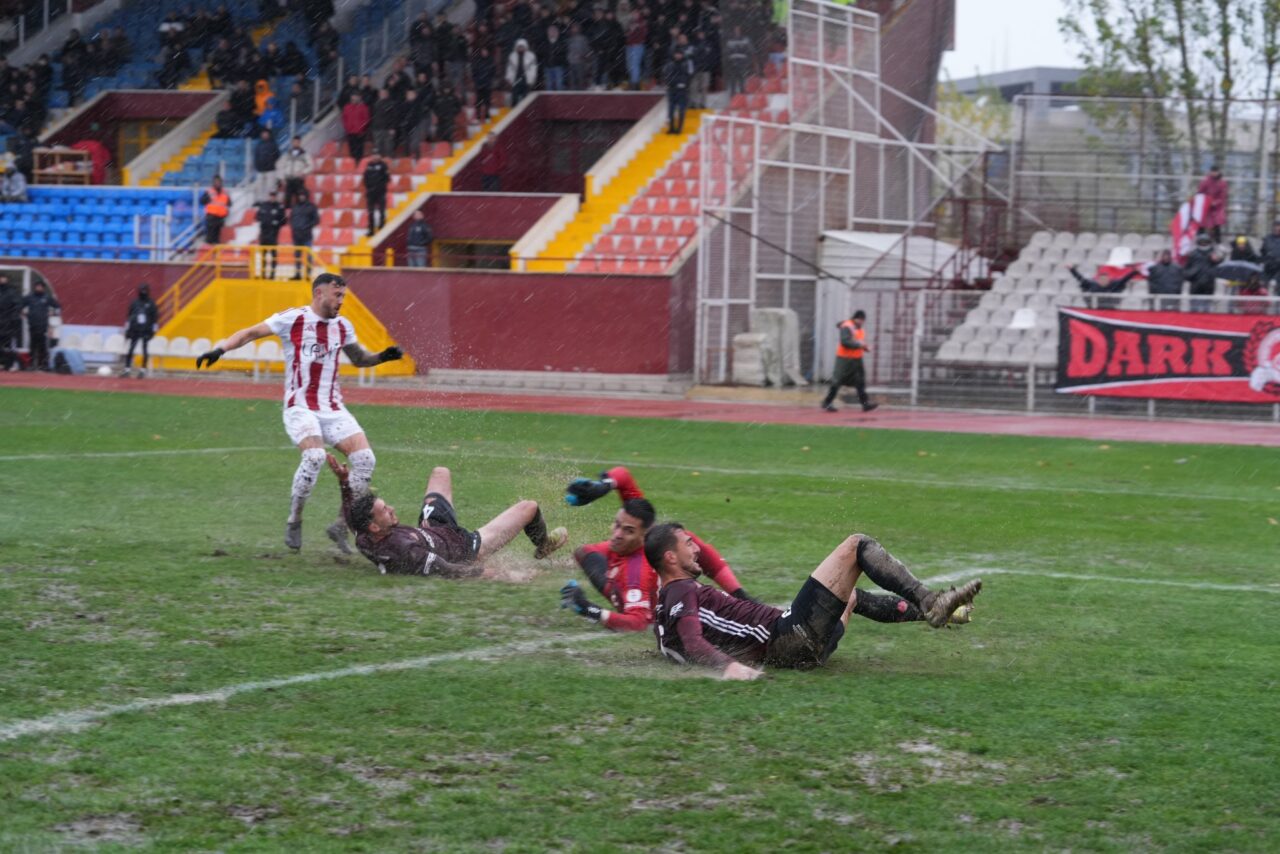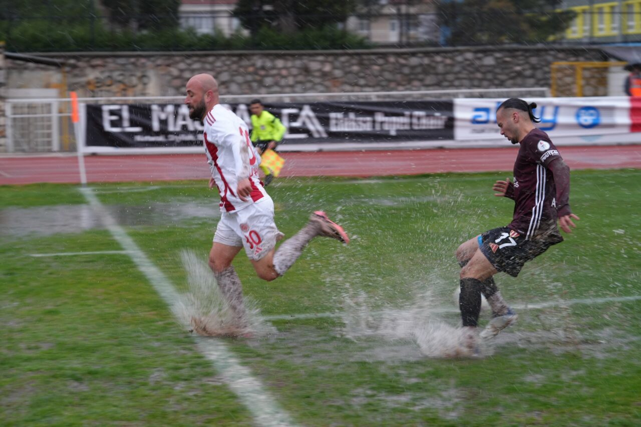 İnegöl Pera Park İlçe Stadı’nda soğuk havada sağanak yağmur altında başlayan ancak daha sonra kar yağışıyla birlikte ağırlaşan zeminde devam eden mücadelede bordo beyazlıların tüm çabası puan almaya yeterli olmadı. Her iki takım futbolcuları, kaygan zeminde ayakta durmakta zorlandı.