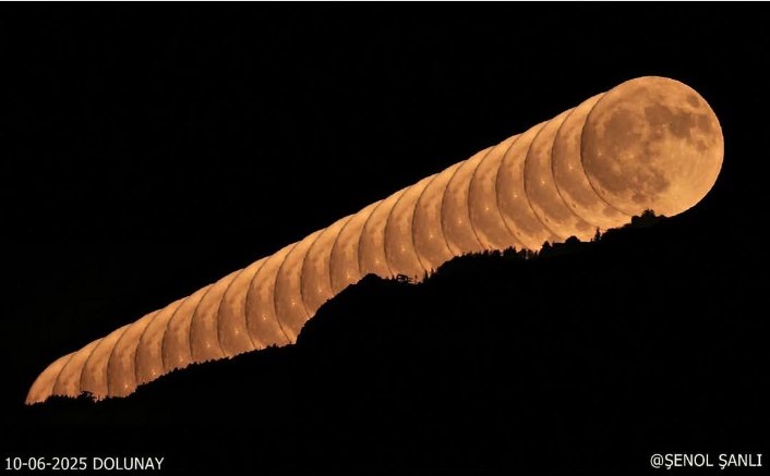 3 gökyüzü fotoğrafçısından Şenol Şanlı, 10 Haziran Salı gecesi dolunayın Uludağ eteklerinden Bursa üzerine yükselişini tam 21 fotoğrafı tek kareye toplayarak görüntüledi.