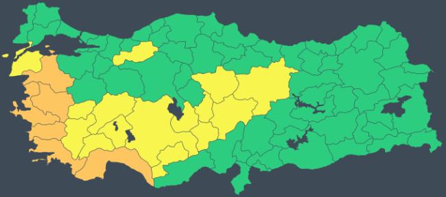 Meteoroloji Genel Müdürlüğü, Afyonkarahisar, Antalya, Aydın, Balıkesir, Bolu, Burdur, Çanakkale, Denizli, Isparta, İzmir, Kayseri, Konya, Manisa, Muğla, Nevşehir, Niğde, Sivas, Uşak, Yozgat, Aksaray ve Karaman için sarı ve turuncu kodlu uyarıda bulundu.