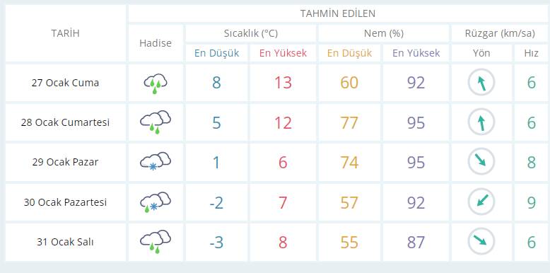Meteoroloji Genel Müdürlüğü tarafından yapılan son değerlendirmelere göre; Ülkemiz genelinin parçalı ve çok bulutlu, Marmara, Ege, Akdeniz, İç Anadolu, Batı Karadeniz ile Doğu ve Gnüneydoğu Anadolu’nun batısının yağışlı geçeceği tahmin ediliyor. Yağışların; Güney ve Kıyı Ege’de kuvvetli, Balıkesir’in batı kıyıları, İzmir, Aydın’ın batısı ve Muğla ile Antalya’nın merkez ve batı ilçelerinde yer yer çok kuvvetli ve şiddetli olması bekleniyor.İç ve doğu kesimlerde sabah saatlerinde yer yer pus ve sis bekleniyor.