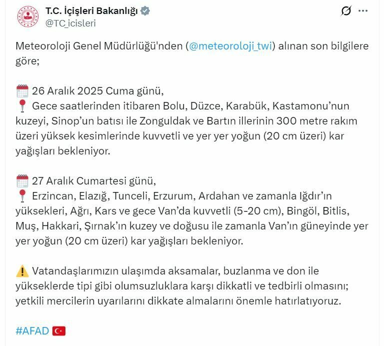 Bakanlığın sanal medya hesabından yapılan açıklamada, “Meteoroloji Genel Müdürlüğü’nden alınan son bilgilere göre; 26 Aralık 2025 Cuma günü gece saatlerinden itibaren Bolu, Düzce, Karabük, Kastamonu’nun kuzeyi, Sinop’un batısı ile Zonguldak ve Bartın illerinin 300 metre rakım üzeri yüksek kesimlerinde kuvvetli ve yer yer yoğun (20 cm üzeri) kar yağışları bekleniyor. 27 Aralık Cumartesi günü, Erzincan, Elazığ, Tunceli, Erzurum, Ardahan ve zamanla Iğdır’ın yüksekleri, Ağrı, Kars ve gece Van’da kuvvetli (5-20 cm), Bingöl, Bitlis, Muş, Hakkari, Şırnak’ın kuzey ve doğusu ile zamanla Van’ın güneyinde yer yer yoğun (20 cm üzeri) kar yağışları bekleniyor. Vatandaşlarımızın ulaşımda aksamalar, buzlanma ve don ile yükseklerde tipi gibi olumsuzluklara karşı dikkatli ve tedbirli olmasını; yetkili mercilerin uyarılarını dikkate almalarını önemle hatırlatıyoruz” denildi. (DHA)