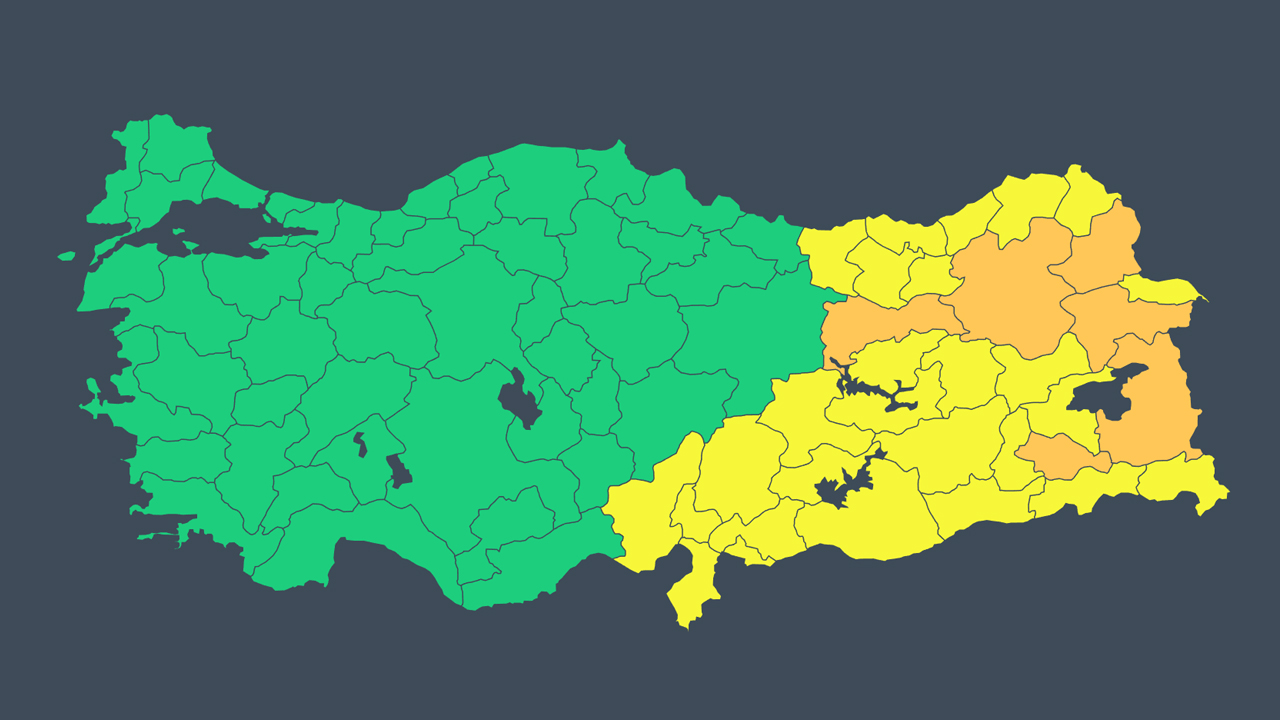 Meteoroloji Genel Müdürlüğü uyarısında Adana, Adıyaman, Ağrı, Artvin, Bingöl, Bitlis, Diyarbakır, Elazığ, Erzincan, Erzurum, Gaziantep, Giresun, Gümüşhane, Hakkari, Hatay, Kars, Malatya, K.Maraş, Mardin, Muş, Rize, Siirt, Trabzon, Tunceli, Şanlıurfa, Van, Bayburt, Batman, Şırnak, Ardahan, Iğdır, Kilis ve Osmaniye illeri yer aldı.
