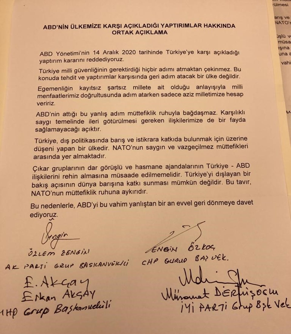 Türkiye Büyük Millet Meclisi’ndeki 4 siyasi parti ABD’nin yaptırım kararını ortak bir bildiri yayımlayarak kınadı.