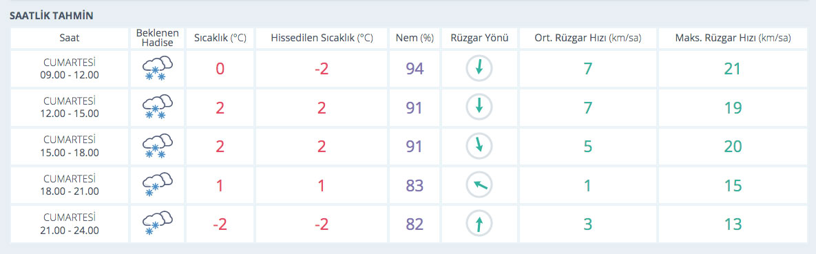 Beklenen yoğun kar yağışı, kuvvetli rüzgar ve sağanak nedeniyle, Adana, Afyonkarahisar, Balıkesir, Bilecik, Bursa, Çanakkale, Eskişehir, Gaziantep, Giresun, Gümüşhane, Hatay, Isparta, Mersin, Kayseri, Kırşehir, Kocaeli, Kütahya, Kahramanmaraş, Muğla, Nevşehir, Niğde, Ordu, Rize, Sakarya, Sivas, Tokat, Trabzon, Uşak, Yozgat, Aksaray, Yalova, Kilis ve Osmaniye için “sarı kod”, Amasya, Ankara, Antalya, Bolu, Çankırı, Çorum, Kastamonu, Konya, Samsun, Sinop, Zonguldak, Karaman, Kırıkkale, Bartın, Karabük ve Düzce için “turuncu kod” uyarısı yapıldı.