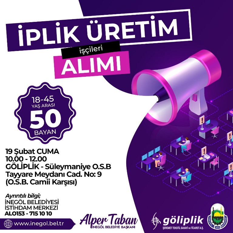 İnegöl Belediyesi İstihdam Merkezinden yapılan açıklamada, iplik üretim fabrikası olan Göliplik’te çalışmak üzere 50 bayan personel alımı yapılacağı duyuruldu. Açıklamada şu ifadelere yer verildi: “İstihdam Merkezimizle işbirliği yapan Göliplik firması, iplik üretim işçileri alımı yapacağını duyurdu. Bu kapsamda 18-45 yaş arası 50 bayan personel alımı yapılacak. Alımı yapılacak personelin; İş-Kur iş başı eğitim programı dahilinde çalışabilecek ve üretimde vardiyalı sistemde ve ayakta çalışabilme kriterlerine uygun olmaları gerektiği belirtildi. Çalışanların çocukları için kreş imkanı sağlanan firmada, ayrıca ikramiye ve sosyal yardımlar da mevcut. İlgili alım için başvurmak isteyenlerin 19 Şubat 2021 Cuma günü 10.00-12.00 saatleri arasında Süleymaniye Mahallesi Organize Sanayi Bölgesinde Tayyare Meydanı Caddesi No:9 adresinde Göliplik Fabrikasına başvurmaları gerekmektedir.”