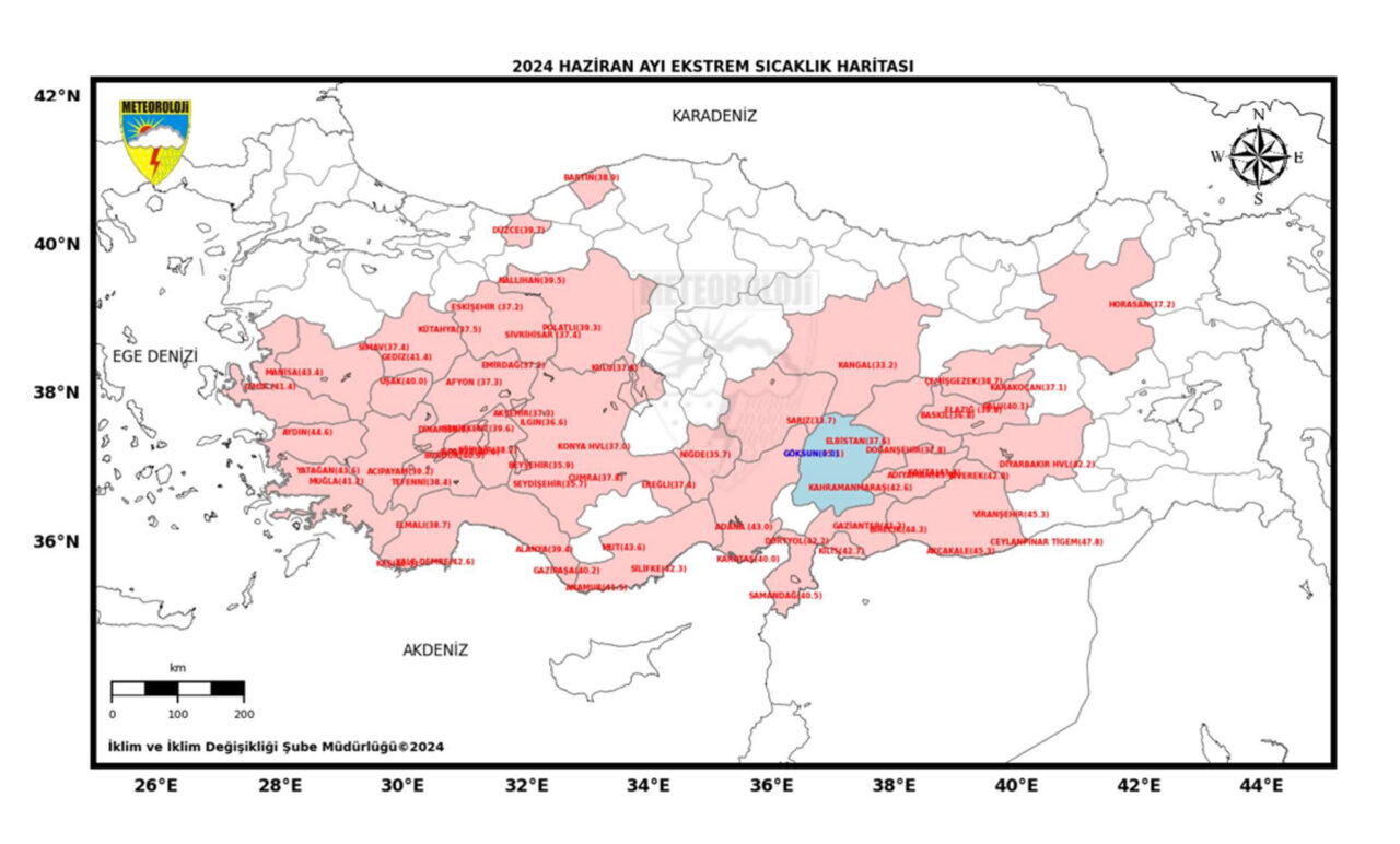 Meteoroloji Genel Müdürlüğü’nün aylık sıcaklık değerlendirmesi verilerine göre; 1991-2020 normalleri haziran ayı ortalama sıcaklığı 21,8 derece olan Türkiye’de, 2024 Haziran’da ortalama sıcaklık 25,4 derece gerçekleşti. En düşük sıcaklık 0 derece ile Göksun’da, en yüksek sıcaklık 47,8 derece ile Ceylanpınar’da ölçüldü. Haziran ayında ortalama sıcaklıklar, Doğubayazıt çevresinde mevsim normallerinde, yurdun diğer bölgelerinde mevsim normalleri üzerinde gerçekleşti.