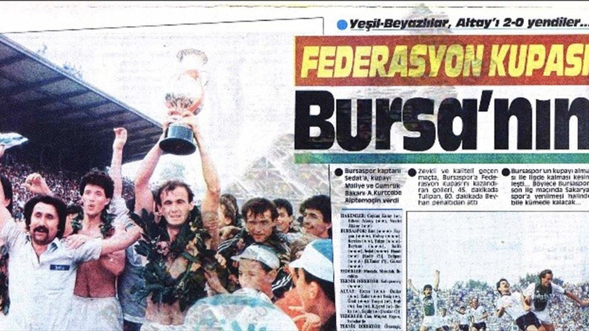 Bursaspor, tarihindeki ilk ve tek Türkiye Kupası’nı 1986 yılında kazandı. Cavit Çağlar’ın başkanlığı döneminde Atatürk Stadı’ndaki finalde Altay’ı Beyhan ve Tulipan’ın golleriyle 2-0 mağlup eden yeşil beyazlı takımın kazandığı kupayı Kaptan Sedat Özden (3) havaya kaldırmıştı.