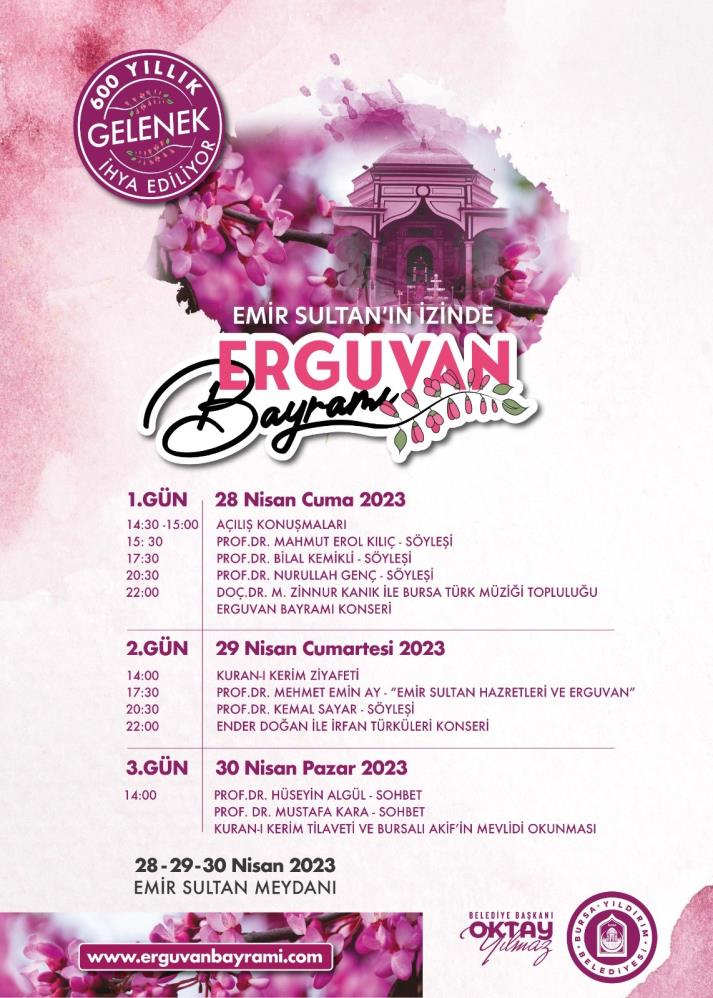 Bursa’da yıllar önce düzenlenen etkinliklerde Anadolu, Rumeli ve gönül coğrafyalarının birçok köşesinden gelen dervişlerle hasbihal edildiğini, halkın o günkü sorunlarına çözümler aranarak ilmi sohbetlerin gerçekleştirildiğini aktaran Yıldırım Belediye Başkanı Oktay Yılmaz, “Yıldırım Belediyesi olarak Erguvan geleneğini sürdürmek, medeniyetimizin tarihin derinliklerinde olan bu köklerinden istifade ederek yeni yaprakların oluşumuna katkı sağlamak, birlik ve beraberliğimize katkı sunmak adına Erguvan Bayramı etkinliklerini geçtiğimiz yıl itibariyle yeniden ihya etmeye başladık. 600 yıllık geleneğimiz olan Erguvan Bayramı’nı inşallah bundan sonra her yıl geleneksel olarak kutlayarak Emir Sultan Hazretleri’ni anacağız” dedi.