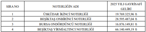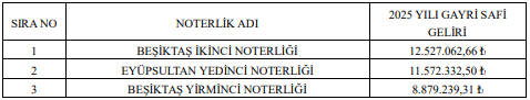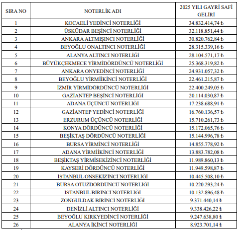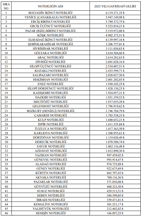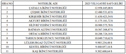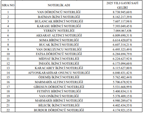Boş bulunan noterliklere talip olacaklar bir yıl içinde ortalama olarak ne kadar kazanacaklarını tahmin etmeleri için Adalet Bakanlığı 2025 yılı gayri safi gelirlerini açıkladı. 162 noterin toplam 2025 yılı geliri 1,3 milyar lirayı aştı.