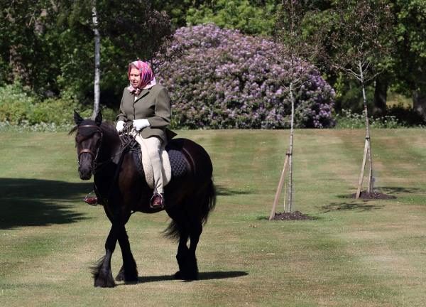 Safkan yarış atı yetiştiricisi olan ve atlara tutkuyla bağlı olan 94 yaşındaki Kraliçe Elizabeth, Windsor Kalesi’nin koronavirüs nedeniyle karantinaya alınmasından sonra ilk kez, renkli bir başörtü, tüvit ceket, binicilik pantolonu, beyaz eldiven ve bot giyip hafta sonu boyunca 14 yaşındaki Balmoral Fern adındaki Fell cinsi midilliye binerken görüntülendi.