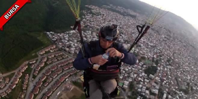 Bursa’da 10 yıldır yamaç paraşütü sporuyla ilgilenen 38 yaşındaki 2 çocuk babası Engin Altop, iftar saatinde paraşütüyle süzülerek 800 metre yükseklikte oruç açtı. İftar saatinin yaklaşmasıyla, Zeyniler Paraşüt Pisti’ne çıkan Engin Altop, hazırlıklarını tamamlamasının ardından paraşütüyle Bursa semalarında süzülmeye başladı. Ezan sesini duyan Altop, önceden hazırladığı çantasındaki zeytin, ekmek, peynir, domates ve tatlıyla orucunu açtı. 800 metre yükseklikte Bursa’yı seyretme ve oruç açma zevki yaşayan Altop, 15 dakika süren uçuş keyfini Akçağlayan TOKİ yakınındaki iniş noktasında sonlandırdı. Altop, gökyüzündeki anları kamerasıyla kayda almayı da ihmal etmedi.
