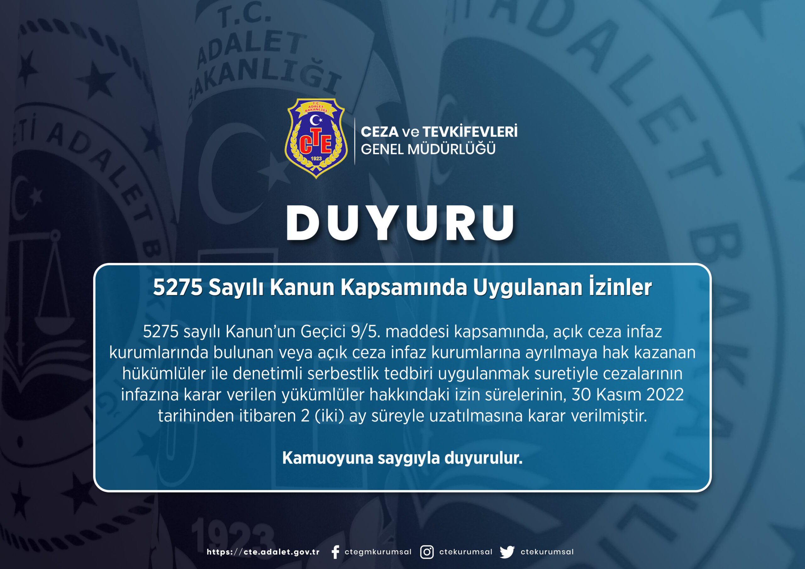 “Açık ceza infaz kurumlarında bulunan veya açık ceza infaz kurumlarına ayrılmaya hak kazanan hükümlüler ile denetimli serbestlik tedbiri uygulanmak suretiyle cezalarının infazına karar verilen yükümlüler hakkındaki izin sürelerinin 2 ay süreyle uzatılmasına karar verilmiştir” açıklamasında bulundu.