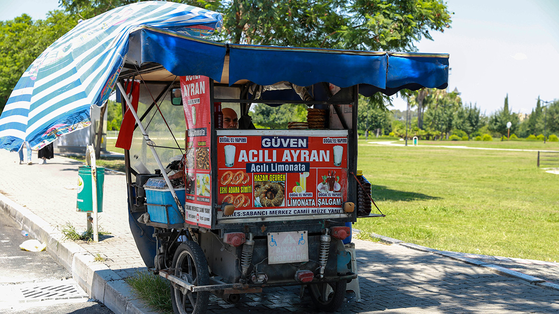 Adana’nın kavurucu sıcaklarının serinleten içeceği acılı ayran, kentin birçok yerinde bulunan seyyar tezgahlarda satılıyor.