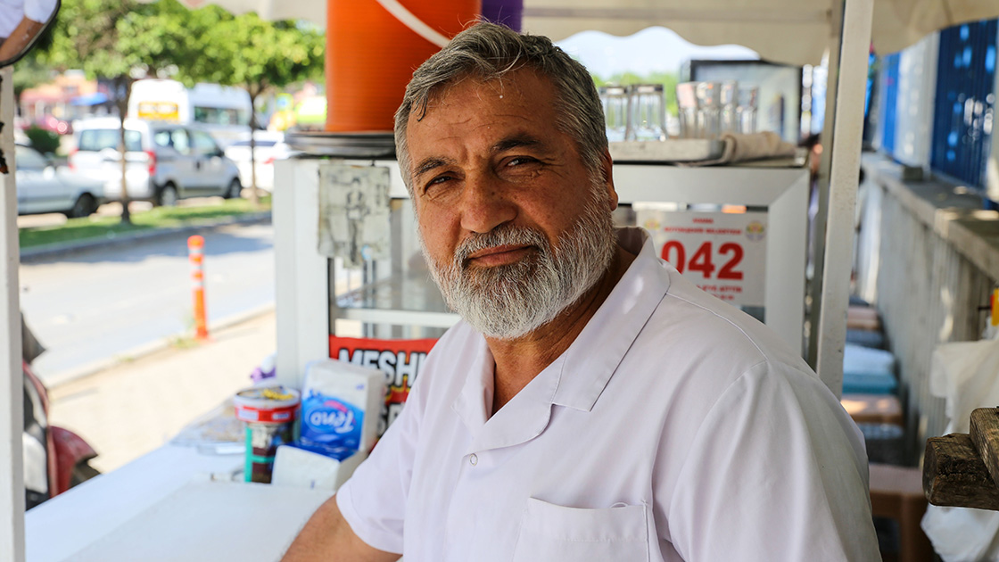 Mustafa Kemal Paşa Bulvarı’nda yaklaşık 40 yıldır seyyar tezgahta acılı ayran satan Servet Özkaya (60), AA muhabirine, işini severek yaptığını söyledi.