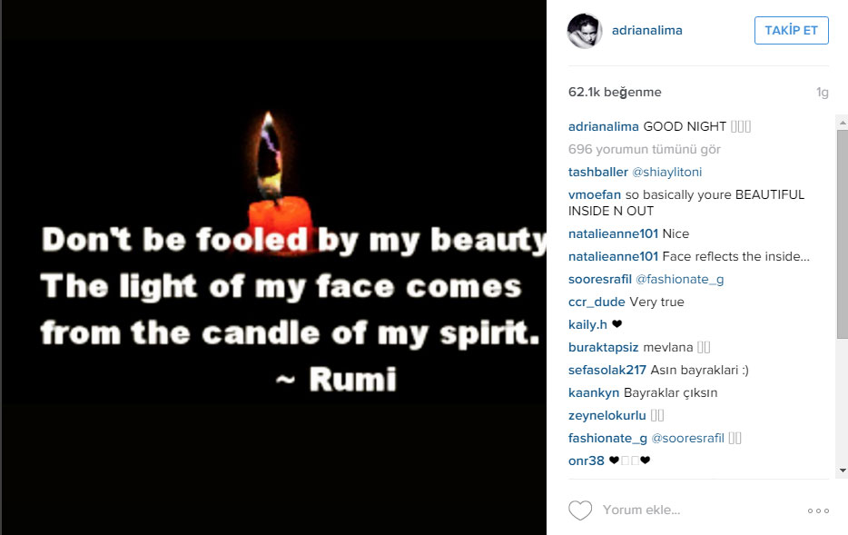 Dünyaca ünlü top model Adriana Lima, 14 Şubat Sevgililer Günü’nünde sosyal paylaşım sitesi Instagram’dan Mevlana’ya ait bir ‘Bir mum diğerini tutuşturmakla ışığından bir şey kaybetmez ‘cümlesinin İngilizcesini paylaştı.