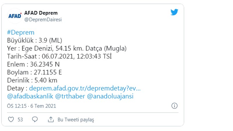 AFAD’ın son dakika bilgilendirmesine göre Muğla’nın Datça ilçesinde 3.9 büyüklüğünde bir deprem meydana geldi.